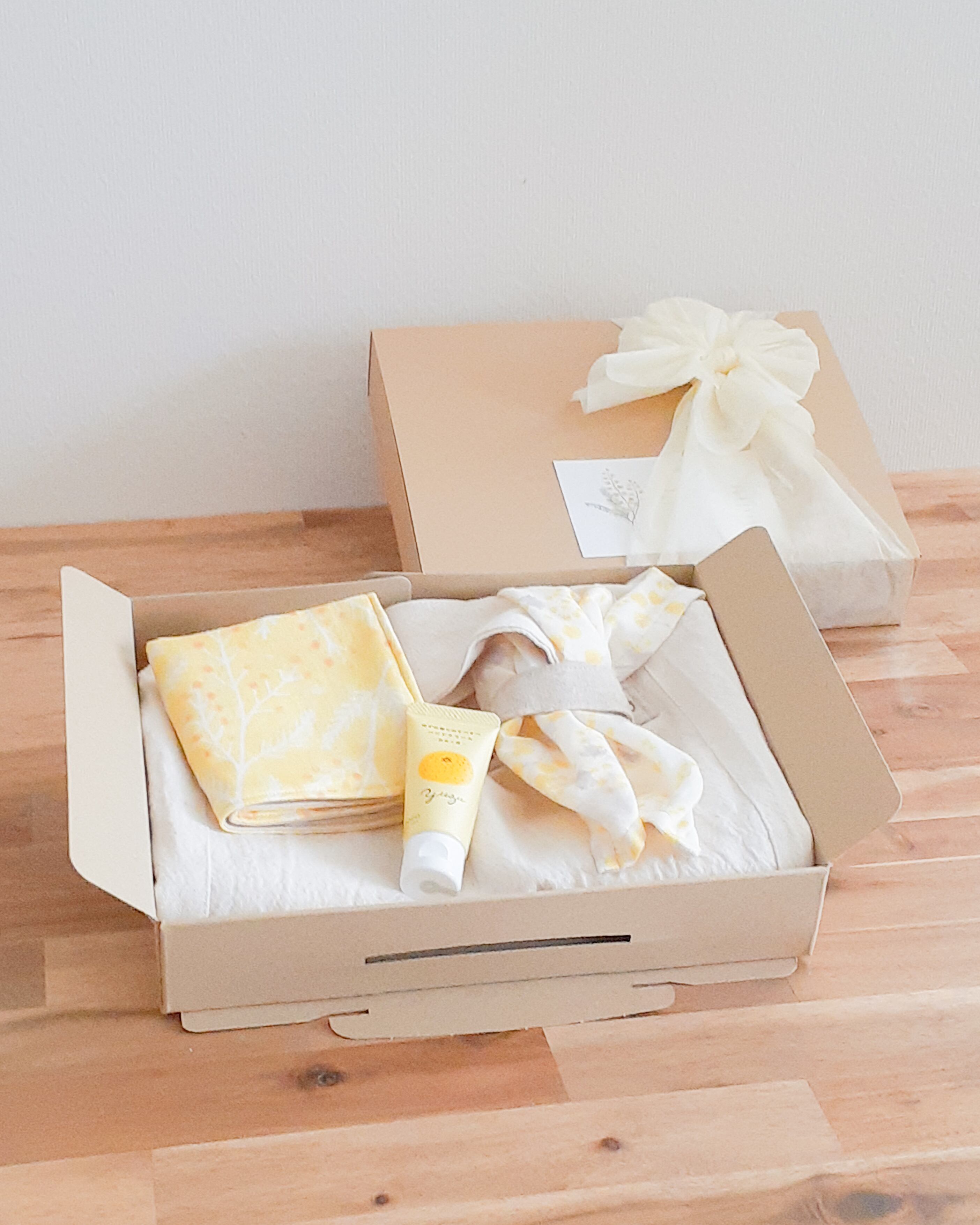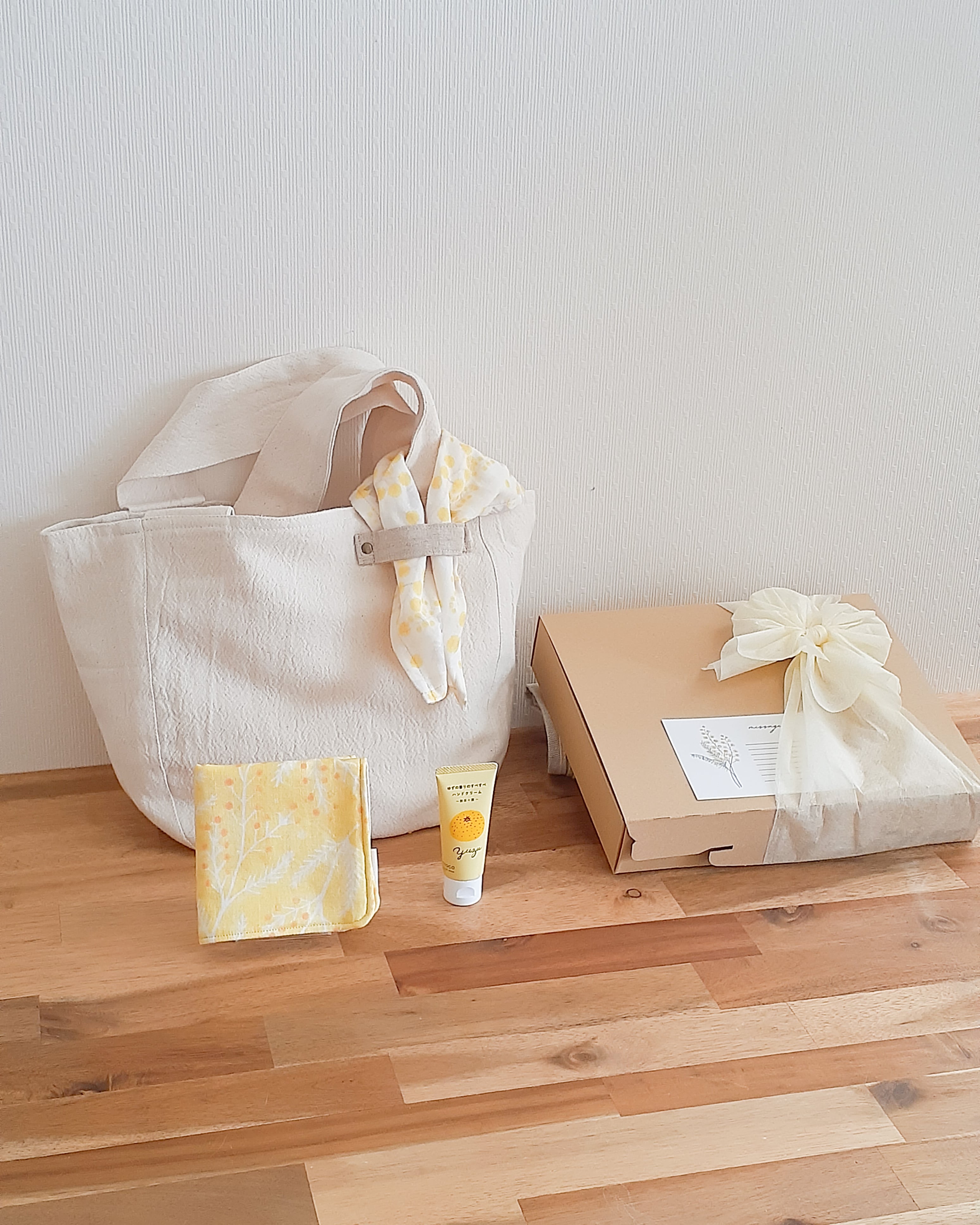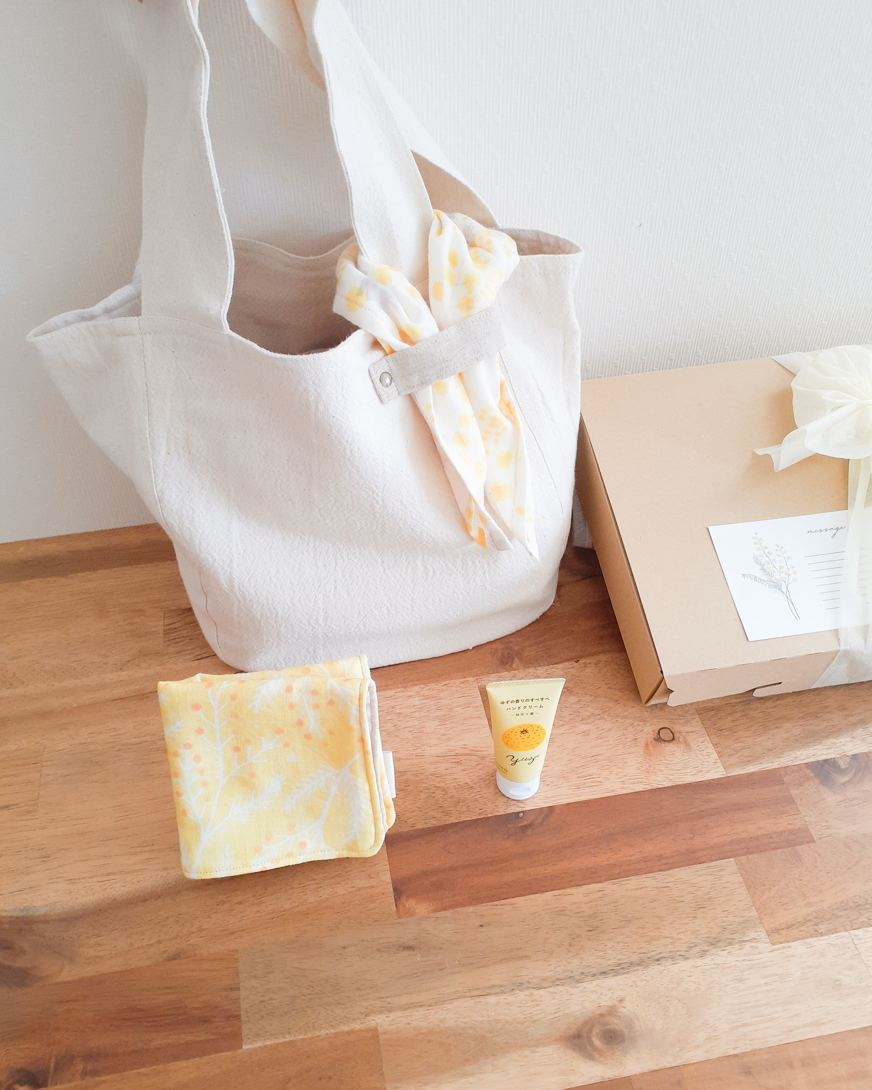 綿100%の触り心地も見た目も優しいナチュラル生地を使用したラウンドバッグ(トートバッグ)にミモザ柄のシンプルハンカチをアレンジして、