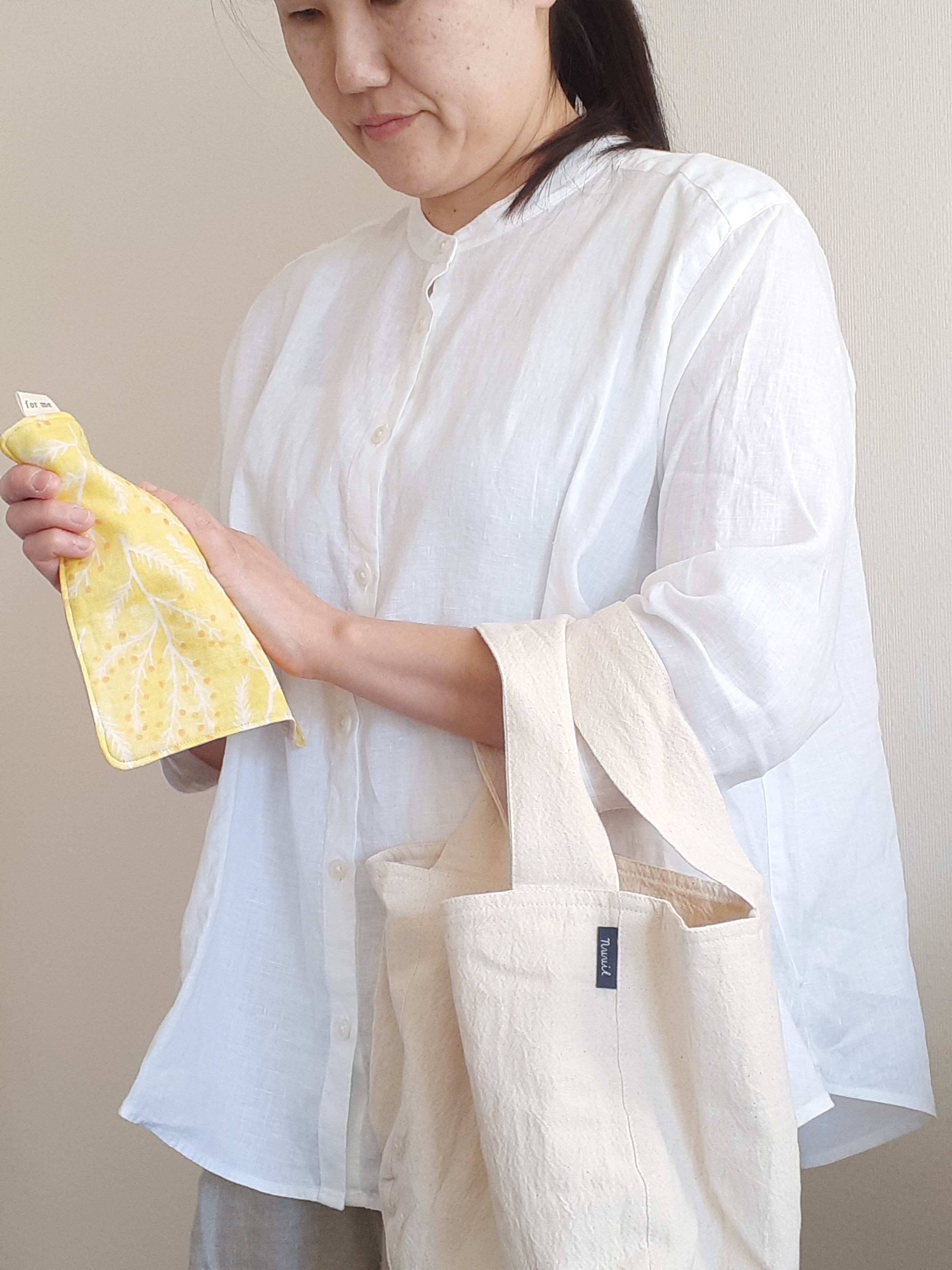 ・ミモザ柄ホワイトのシンプルハンカチ(1枚仕立て)をトートバッグに組み合わせて使います