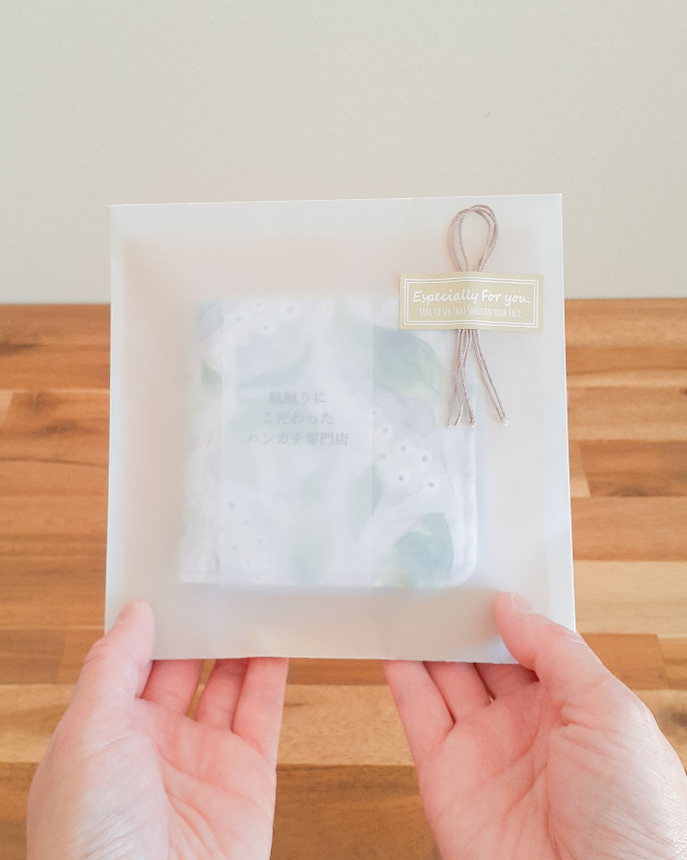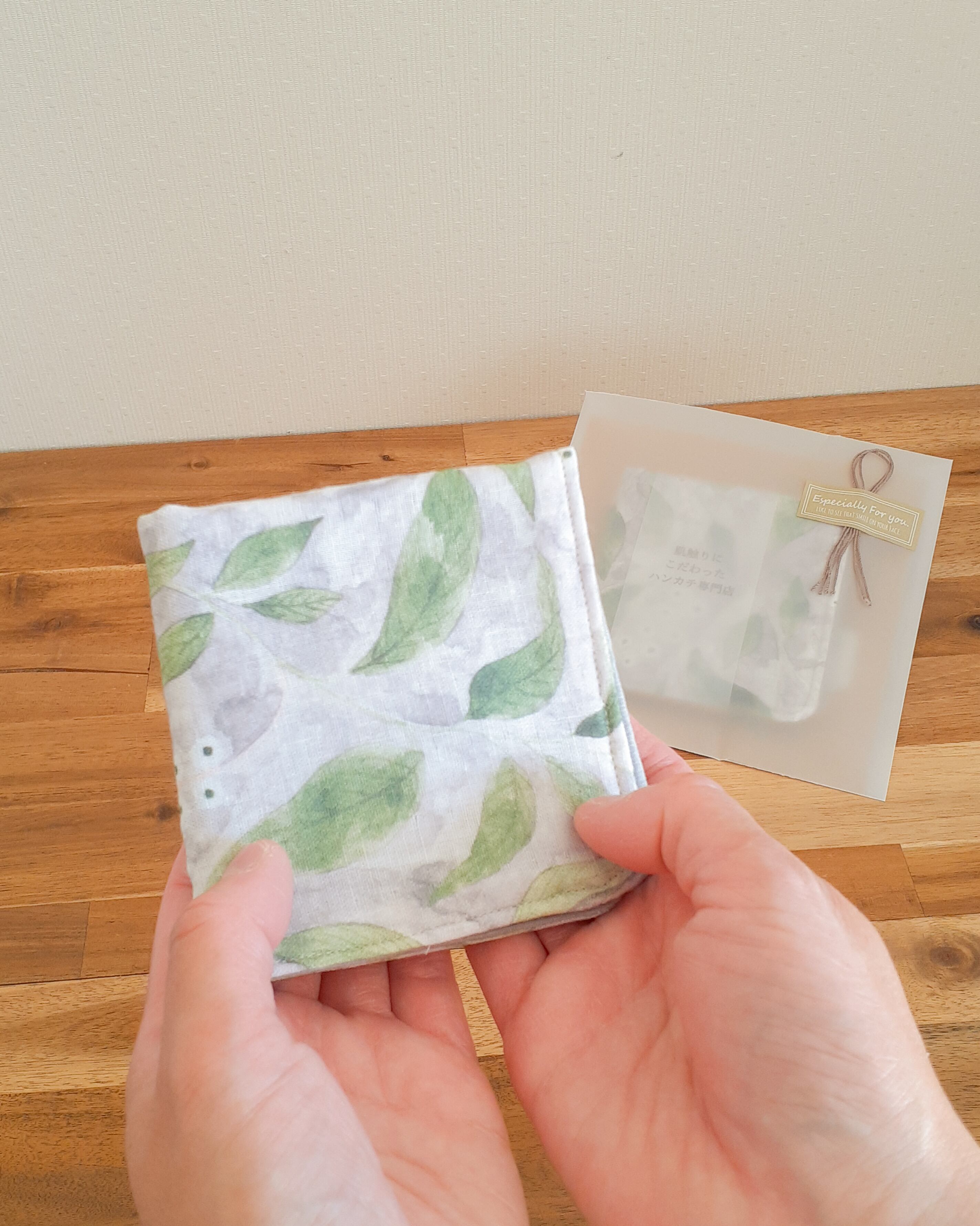 綿100%、ダブルガーゼのプリント生地とダブルガーゼのハンカチは触り心地もよく、手から感じる心地よさを実現しました